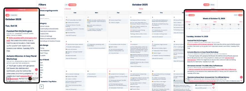 Now you can search and filter events by category, date, and my top recommendations, as well as see it in an easier to read list view or on a calendar. Choose between a monthly or weekly view.
