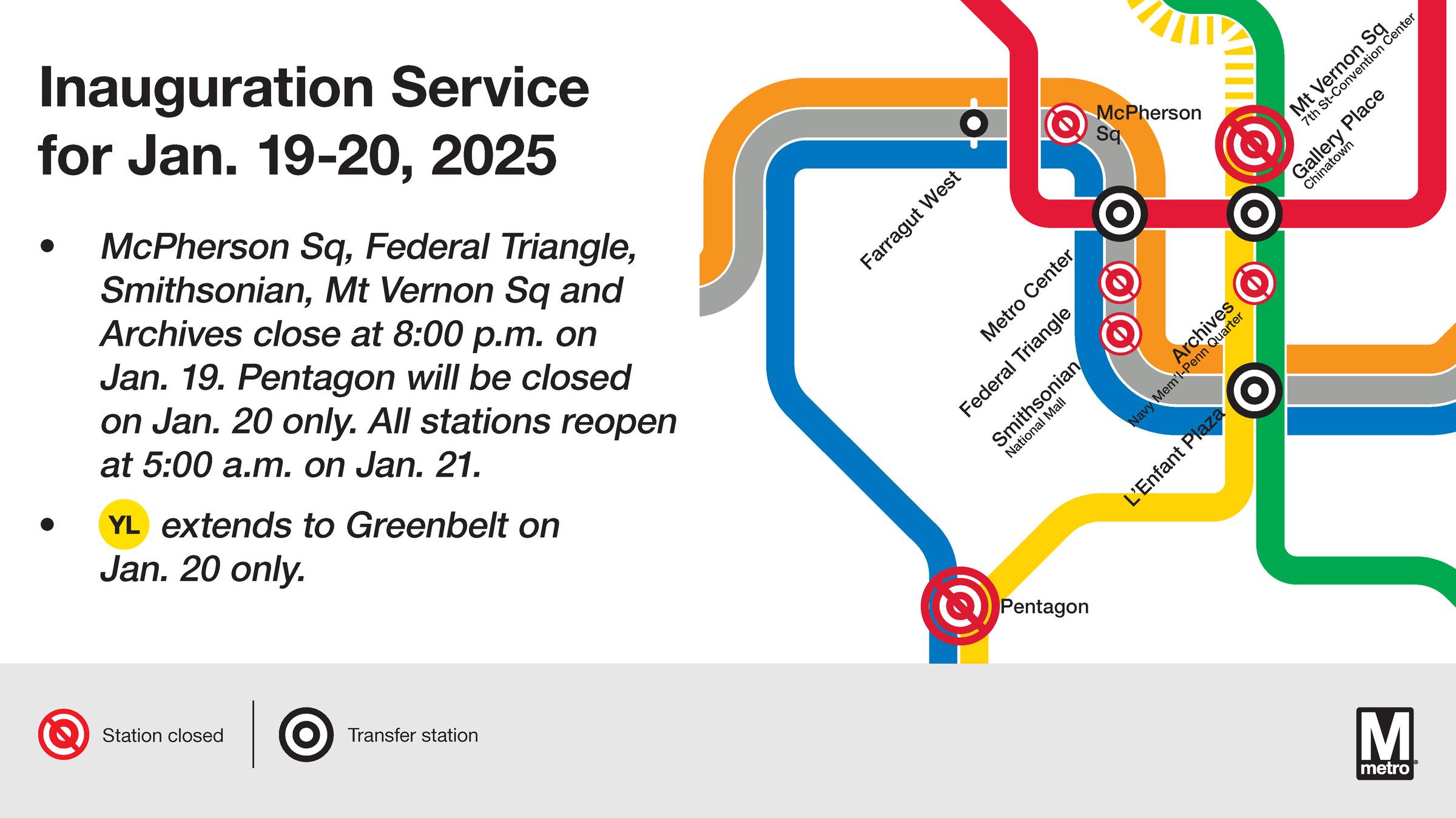 For metro, stations are closed the evening of Sunday Jan 19 and all day Monday Jan 20. At least the yellow line is extended out to Greenbelt for those brave enough to leave the house.